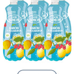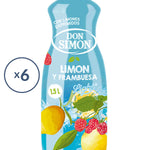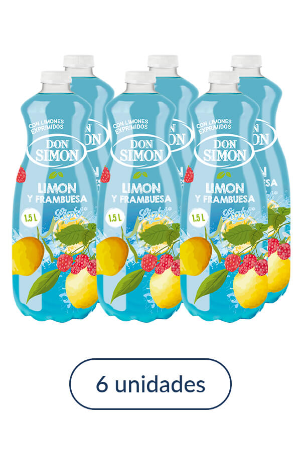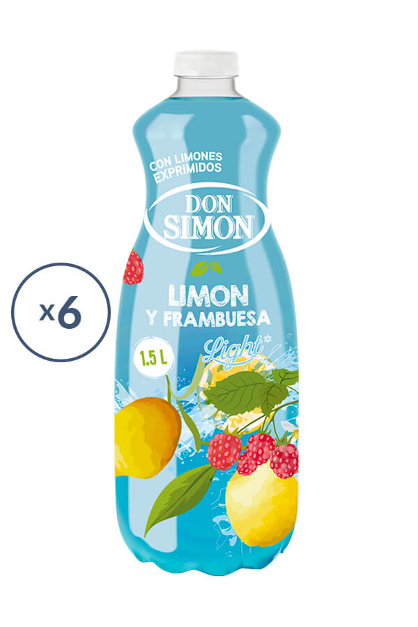 Limonada con frambuesa Don Simón. Elaborada con el zumo de 6 limones exprimidos procedentes de Murcia y jugosas frambuesas.Esta versión light contiene un 50% menos de azúcares que una normal.