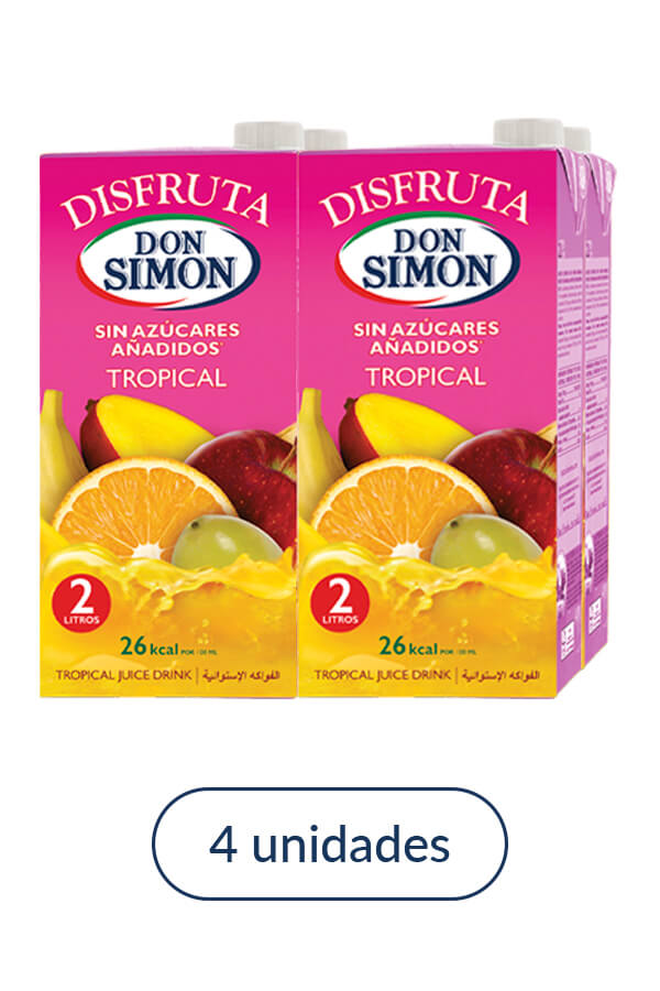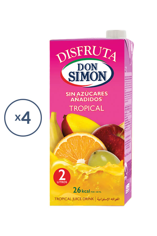 Enjoy Don Simon tropical. Made with orange, apple, banana, mango and passion fruit. No added sugars, low in calories.
