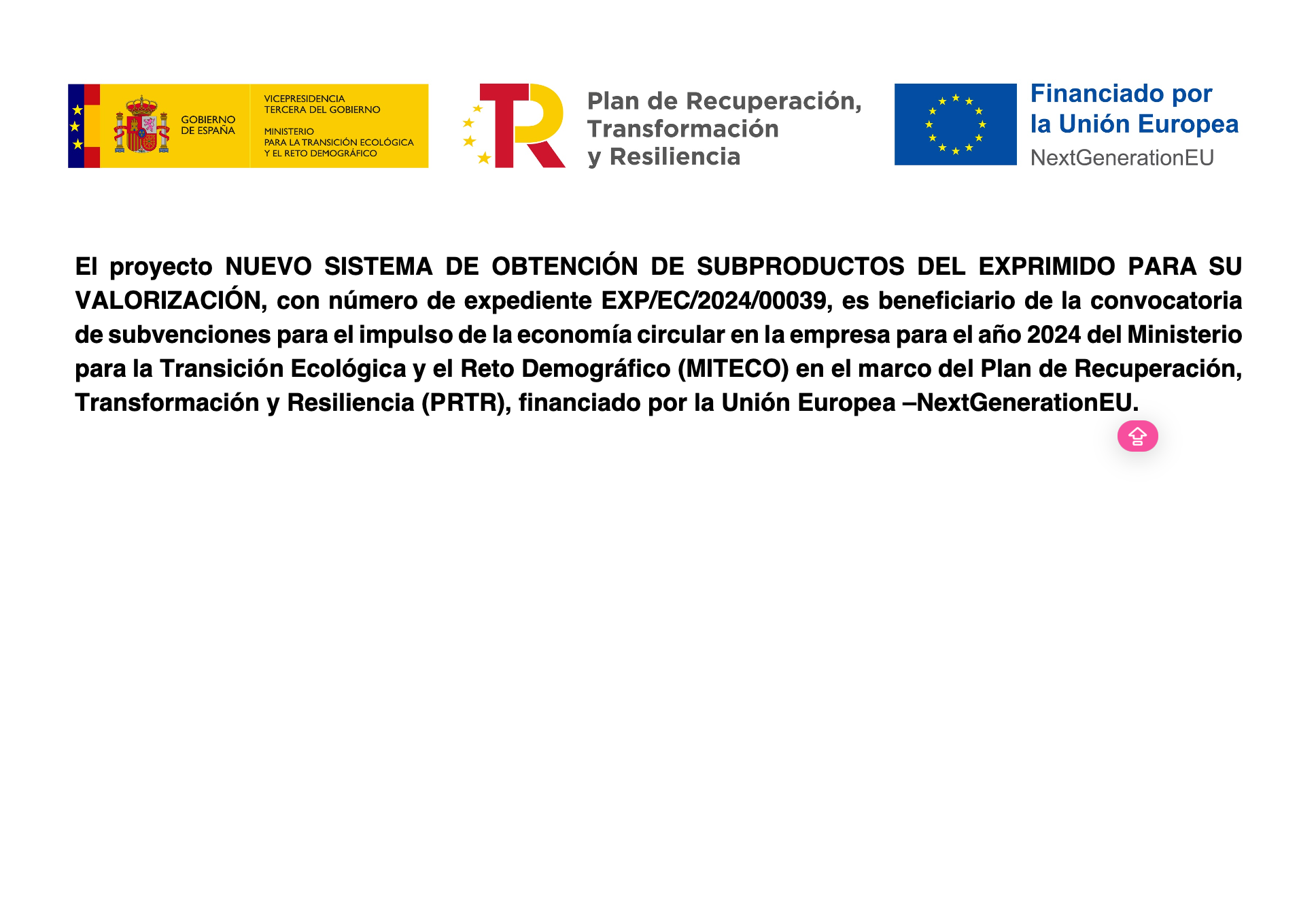 The project "New efficient aseptic packaging line to increase product shelf life" is a beneficiary of the Ministry for Ecological Transition and the Demographic Challenge (MITECO) call for grants to promote the circular economy in companies for 2022, within the framework of the Recovery, Transformation and Resilience Plan (PRTR), financed by the European Union – NextGenerationEU.