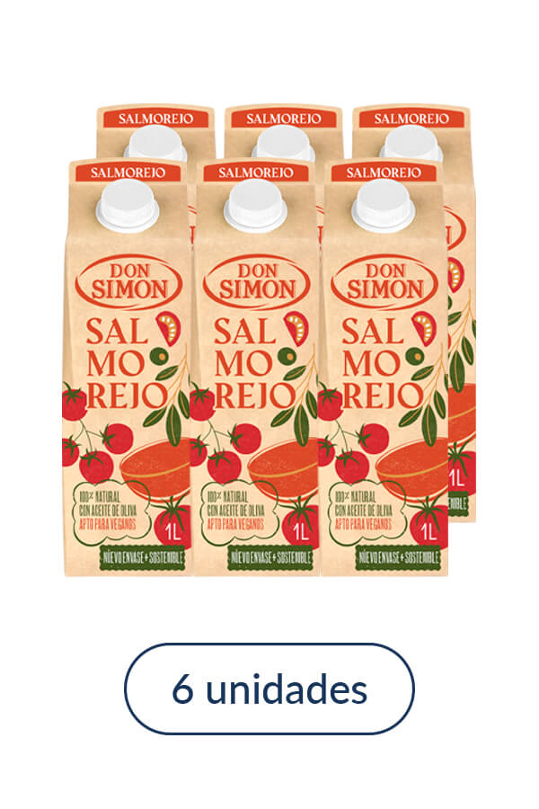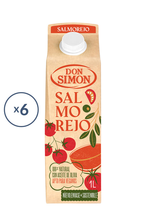 Don Simón Salmorejo, the best of the Mediterranean diet. Made with the best fresh vegetables and extra virgin olive oil. Contains gluten. Refrigerated product. 1 litre aluminium-free organic packaging.