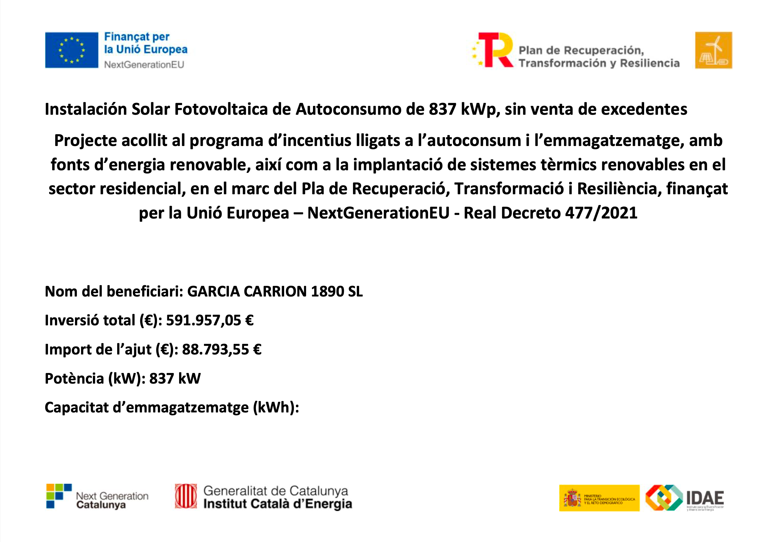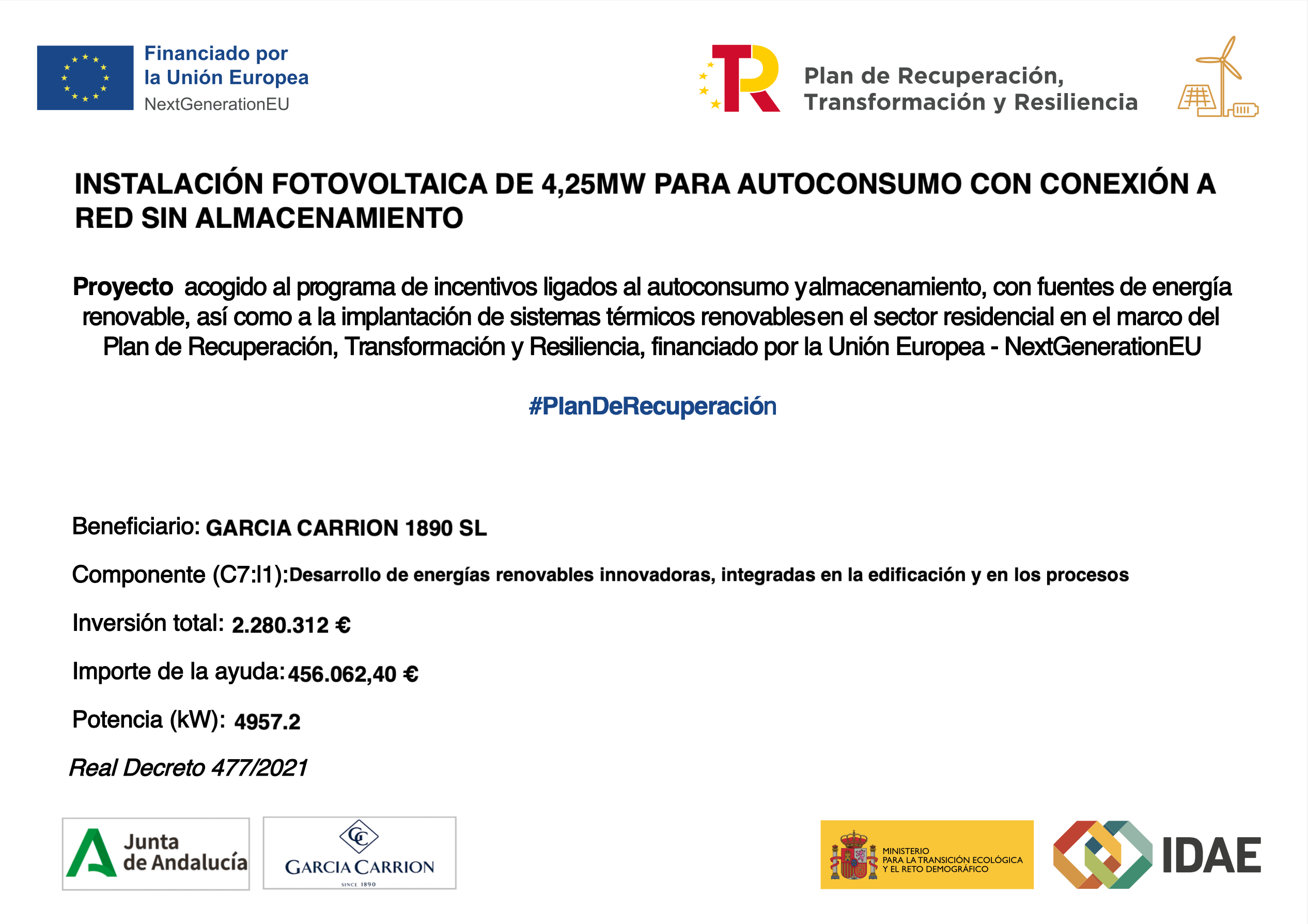 GARCÍA CARRIÓN 1890, S.L., en línea con su compromiso con el medio ambiente, el fomento del uso de energías renovables y la reducción del consumo energético, ha llevado a cabo la implementación de una instalación fotovoltaica de autoconsumo sin excedentes. El objetivo principal de la misma ha sido generar electricidad de manera sostenible y eficiente, y, asimismo, reducir su dependencia de fuentes de energía convencionales, mejorando la seguridad de abastecimiento. La actuación ha sido financiada con el apoyo de la Unión Europea dentro del marco del Plan de Recuperación, Transformación y Resiliencia, a través de los Fondos Next Generation EU. La implementación se ha llevado a cabo en el centro productivo de la sociedad ubicada en Daimiel, y ha implicado la instalación de inversores y módulos fotovoltaicos en las inmediaciones de la fábrica, con una potencia total de generación de 5.307 kW y una potencia nominal de inversores de 4.500 kW. La inversión ha ascendido a un total de 3.618.366,77 €, de los cuales han sido subvencionados 345.000,00 €.