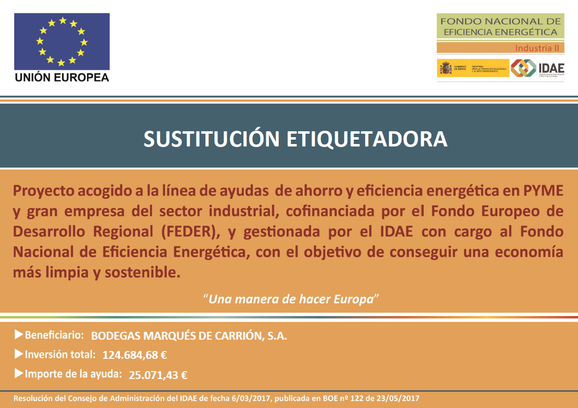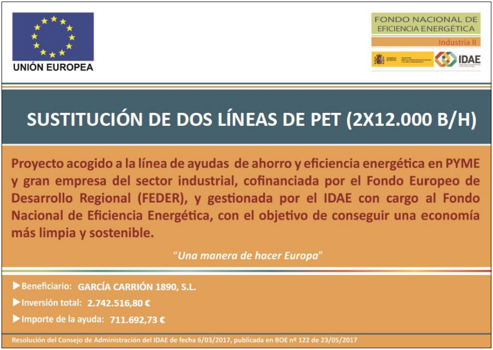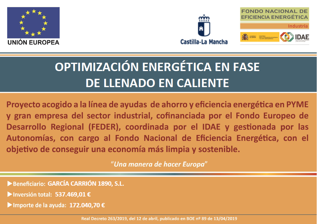 GARCÍA CARRIÓN 1890, S.L. ha recibido una ayuda para su proyecto de ahorro y eficiencia energética IMPLANTACIÓN DE UN SISTEMA DE AUTOMATIZACIÓN DE PROCESOS, cofinanciada por el Fondo Europeo de Desarrollo Regional (FEDER), coordinada por IDAE y gestionada por las autonomías, con cargo al Fondo Nacional de Eficiencia Energética, con el objetivo de conseguir una economía más limpia y sostenible. Se ha mejorado el sistema de fase de llenado en caliente. Se ha requerido la colaboración de los mejores fabricantes de equipamiento del sector, que nos aportarán grandes ahorros energéticos y medioambientales en el proceso. Gracias al proyecto se ahorran 100,17 teps anuales.