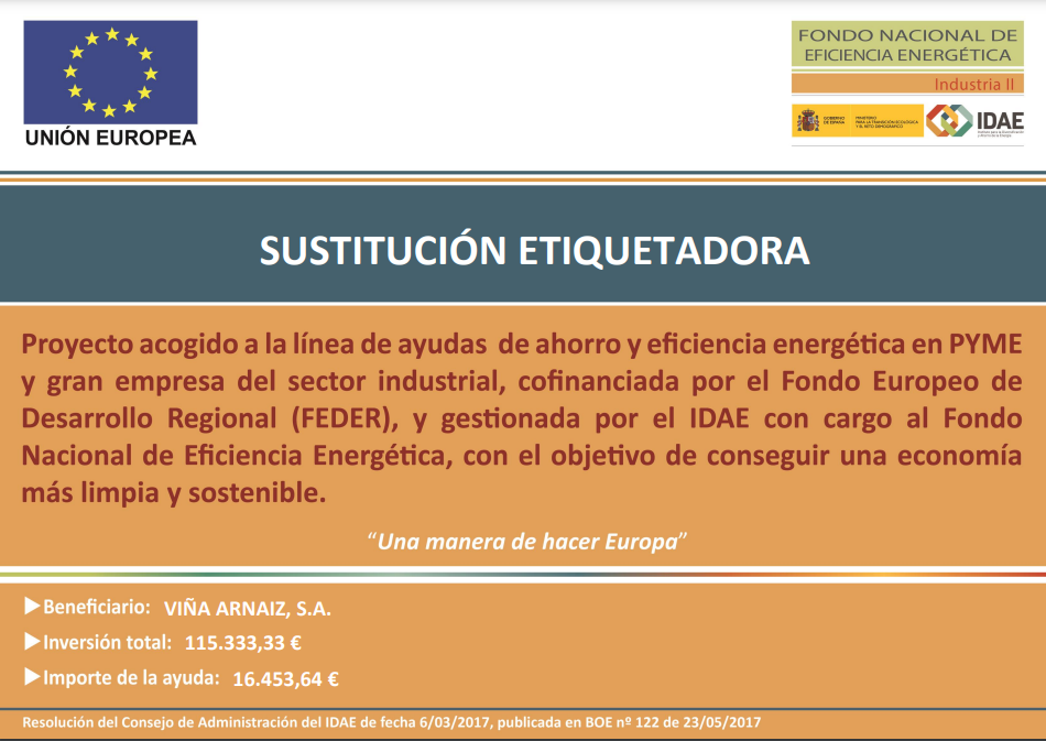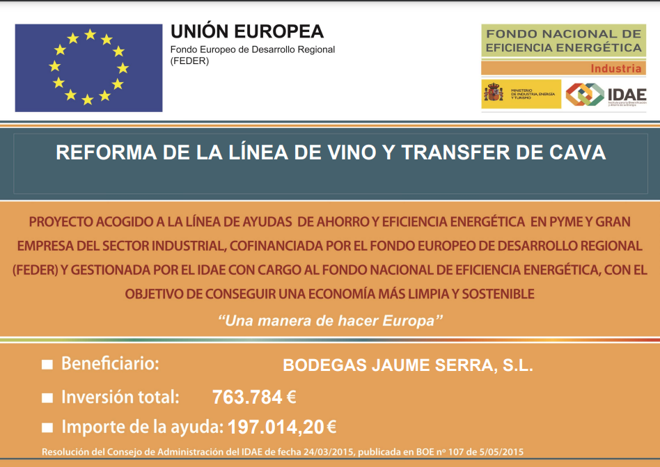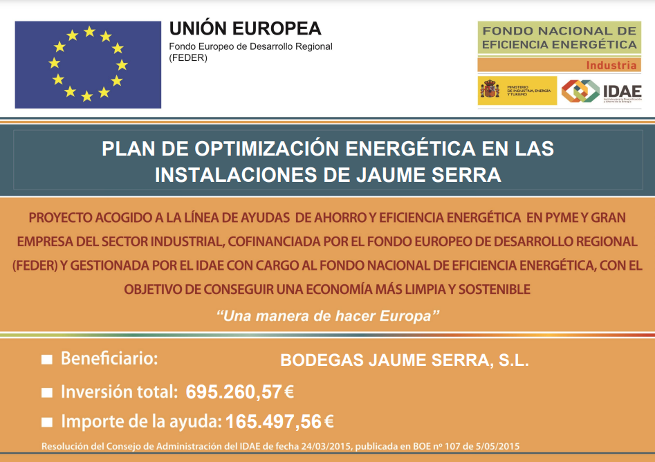 BODEGAS JAUME SERRA, SL. ha recibido una ayuda para su proyecto de ahorro y eficiencia energéticaREFORMA DE LA LÍNEA DE VINO Y TRANSFER DE CAVAa través del FONDO NACIONAL DE EFICIENCIA ENERGÉTICA y gestionado por el INSTITUTO DE DIVERSIFICACIÓN Y AHORRO DE LA ENERGÍA (IDAE), ayuda cofinanciada por la Unión Europea a través del Programa Operativo FEDER de Crecimiento Inteligente 2014-2020. El proyecto ha consistido en reformar una de las líneas de embotellado, separando en 2 líneas productivas diferenciadas, la línea de embotellado inicial para el embotellado de vino por un lado y el transfer del botellín de cava, por otro lado, que nos aportarán grandes ahorros energéticos y medioambientales en el proceso, consiguiendo un ahorro estimado de 53,49 tep/año.