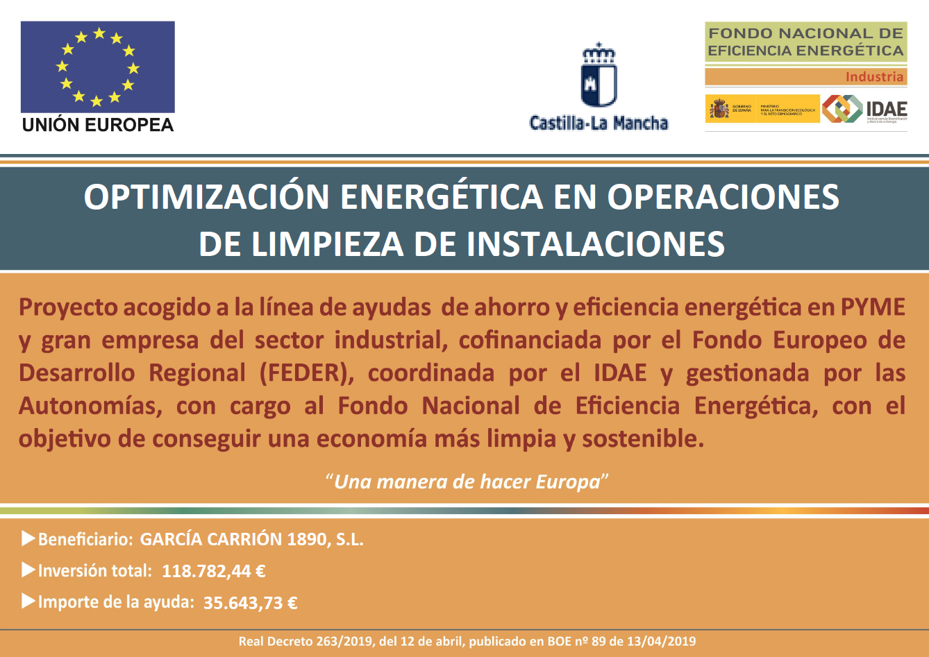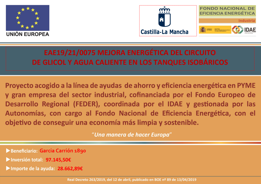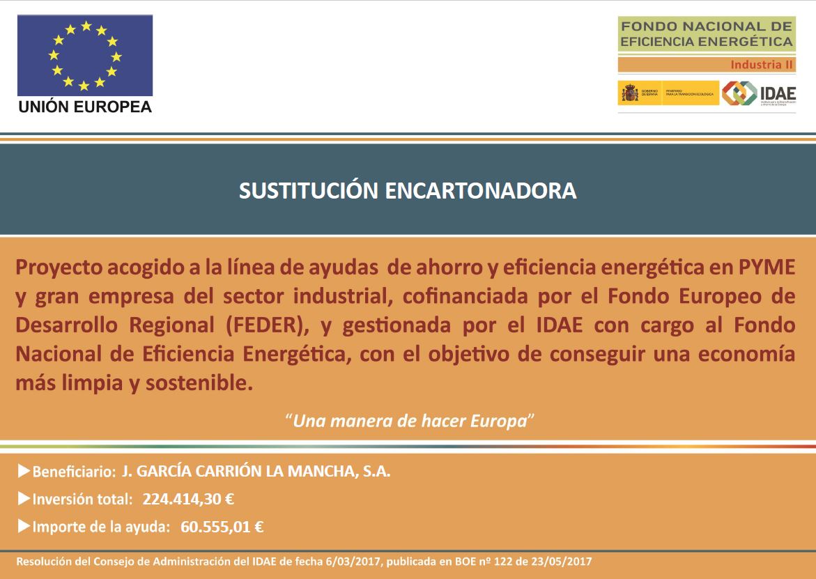 GARCÍA CARRIÓN 1890, S.L. ha recibido una ayuda para su proyecto de ahorro y eficiencia energética OPTIMIZACIÓN ENERGÉTICA EN OPERACIONES DE LIMPIEZA DE INSTALACIONES, cofinanciada por el Fondo Europeo de Desarrollo Regional (FEDER), coordinada por IDAE y gestionada por las autonomías, con cargo al Fondo Nacional de Eficiencia Energética, con el objetivo de conseguir una economía más limpia y sostenible. Se ha mejorado el sistema de limpieza de las instalaciones en la planta de Daimiel. Se ha requerido la colaboración de los mejores fabricantes de equipamiento del sector, que nos aportarán grandes ahorros energéticos y medioambientales en el proceso. Gracias al proyecto se ahorran 66,64 teps anuales.