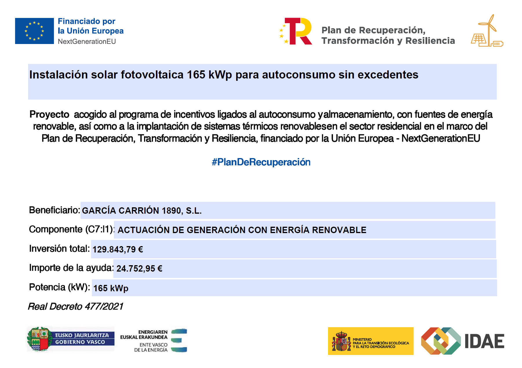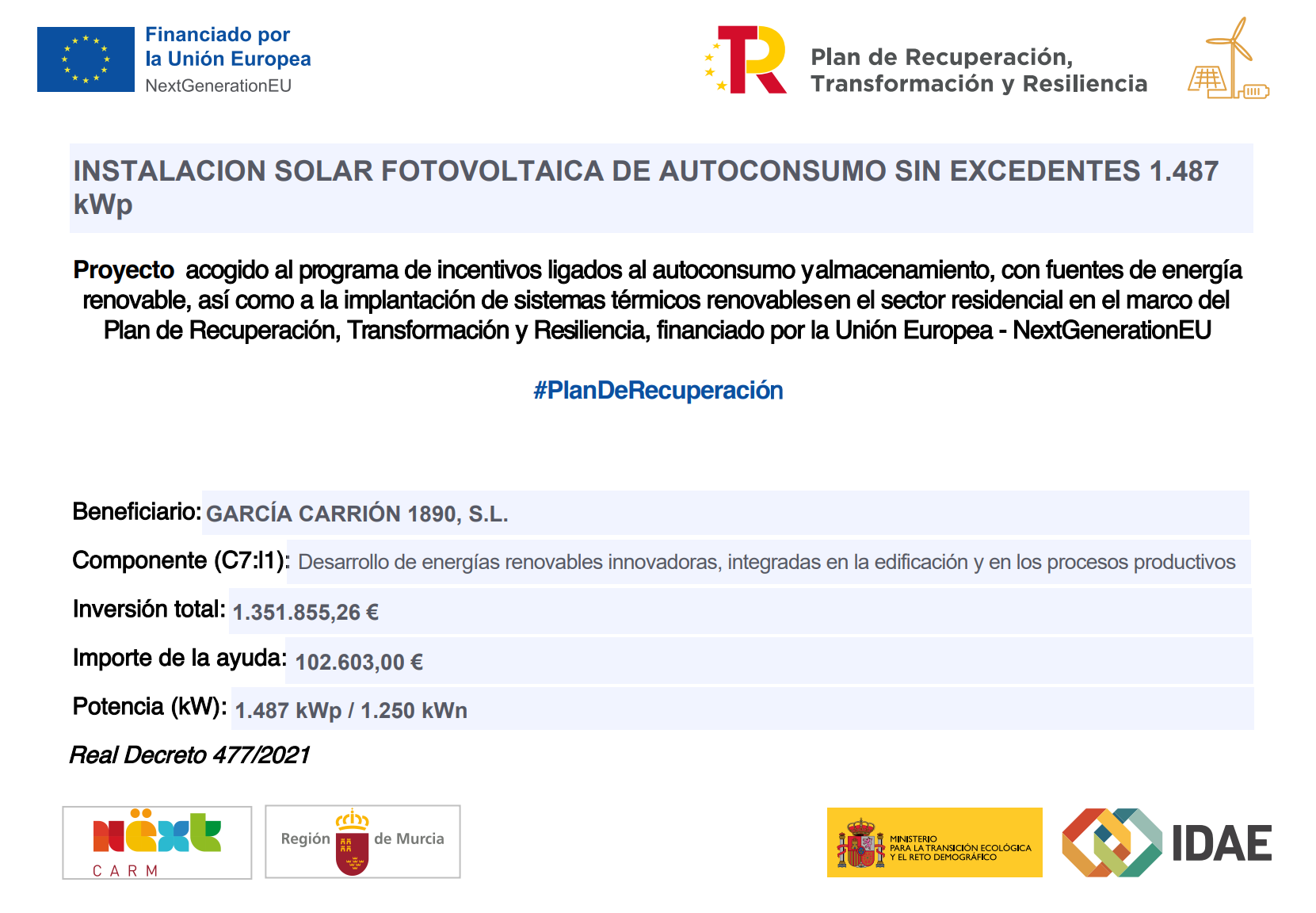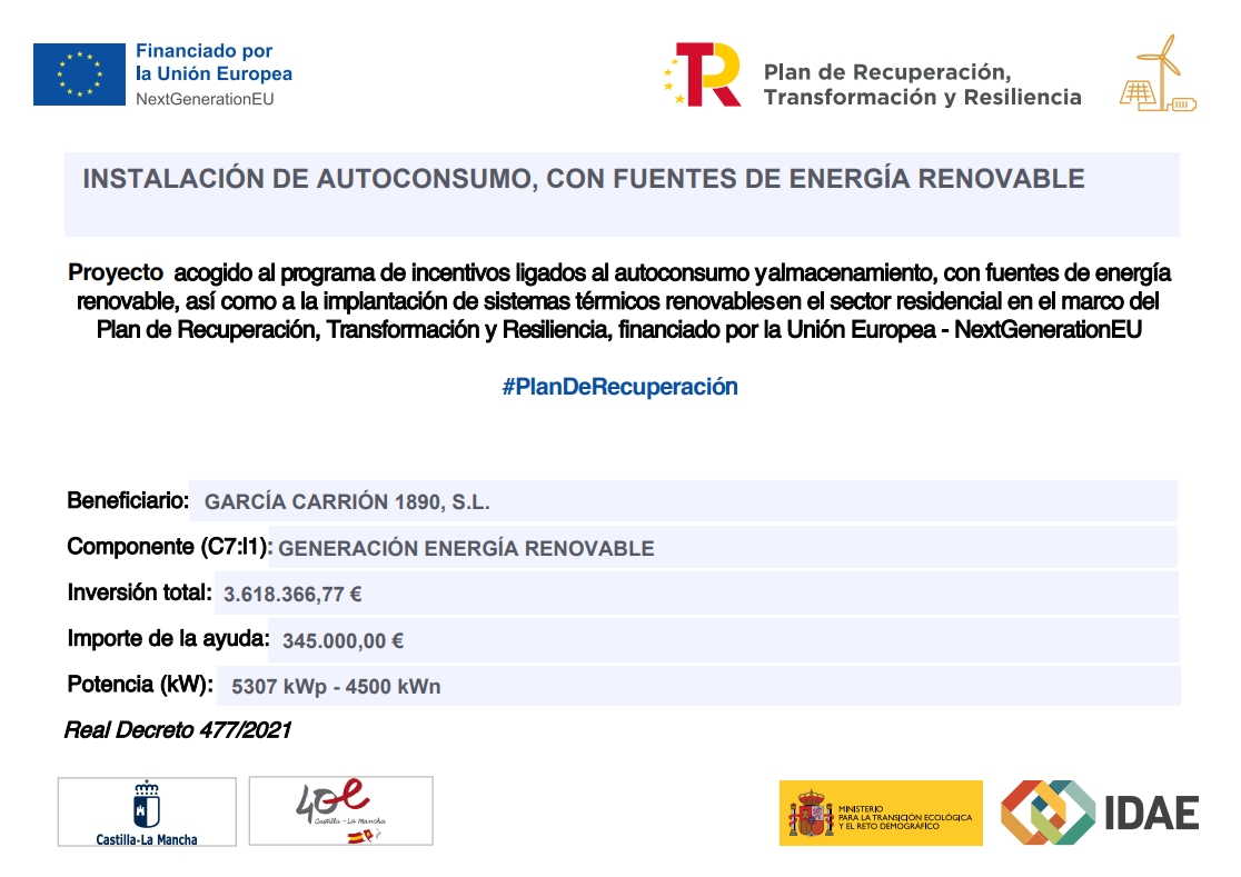 GARCÍA CARRIÓN 1890, S.L., en línea con su compromiso con el medio ambiente, el fomento del uso de energías renovables y la reducción del consumo energético, ha llevado a cabo la implementación de una instalación fotovoltaica de autoconsumo sin excedentes. El objetivo principal de la misma ha sido generar electricidad de manera sostenible y eficiente, y, asimismo, reducir su dependencia de fuentes de energía convencionales, mejorando la seguridad de abastecimiento. La actuación ha sido financiada con el apoyo de la Unión Europea dentro del marco del Plan de Recuperación, Transformación y Resiliencia, a través de los Fondos Next Generation EU. La implementación se ha llevado a cabo en el centro productivo de la sociedad ubicada en Daimiel, y ha implicado la instalación de inversores y módulos fotovoltaicos en las inmediaciones de la fábrica, con una potencia total de generación de 5.307 kW y una potencia nominal de inversores de 4.500 kW. La inversión ha ascendido a un total de 3.618.366,77 €, de los cuales han sido subvencionados 345.000,00 €.