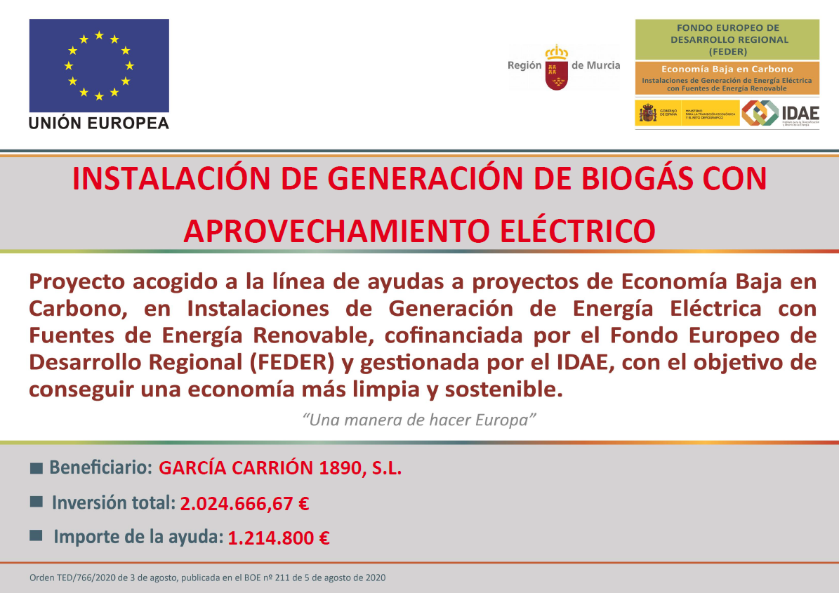 GARCÍA CARRIÓN 1890, S.L. ha recibido una ayuda para su proyecto de ahorro y eficiencia energética “INSTALACIÓN DE GENERACIÓN DE BIOGÁS CON APROVECHAMIENTO ELÉCTRICO”, cofinanciada por el Fondo Europeo de Desarrollo Regional (FEDER), coordinada por IDAE y gestionada por las autonomías, con cargo al Fondo Nacional de Eficiencia Energética, con el objetivo de conseguir una economía más limpia y sostenible. Se ha elaborado un proyecto de generación de energía eléctrica renovable a partir de la obtención de biogás de la EDAR. Se ha instalado un sistema de digestión anaerobia en la planta de depuración de aguas residuales, para la obtención de biogás, y un sistema de cogeneración mediante turbina para la generación de energía eléctrica. Se ha requerido la colaboración de los mejores fabricantes de equipamiento del sector. Los indicadores del resultado del proyecto han sido: indicador C030 = 0,6 MW e indicador C034 = 958,31 tCO2/año.