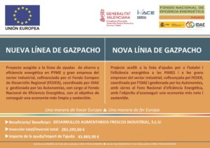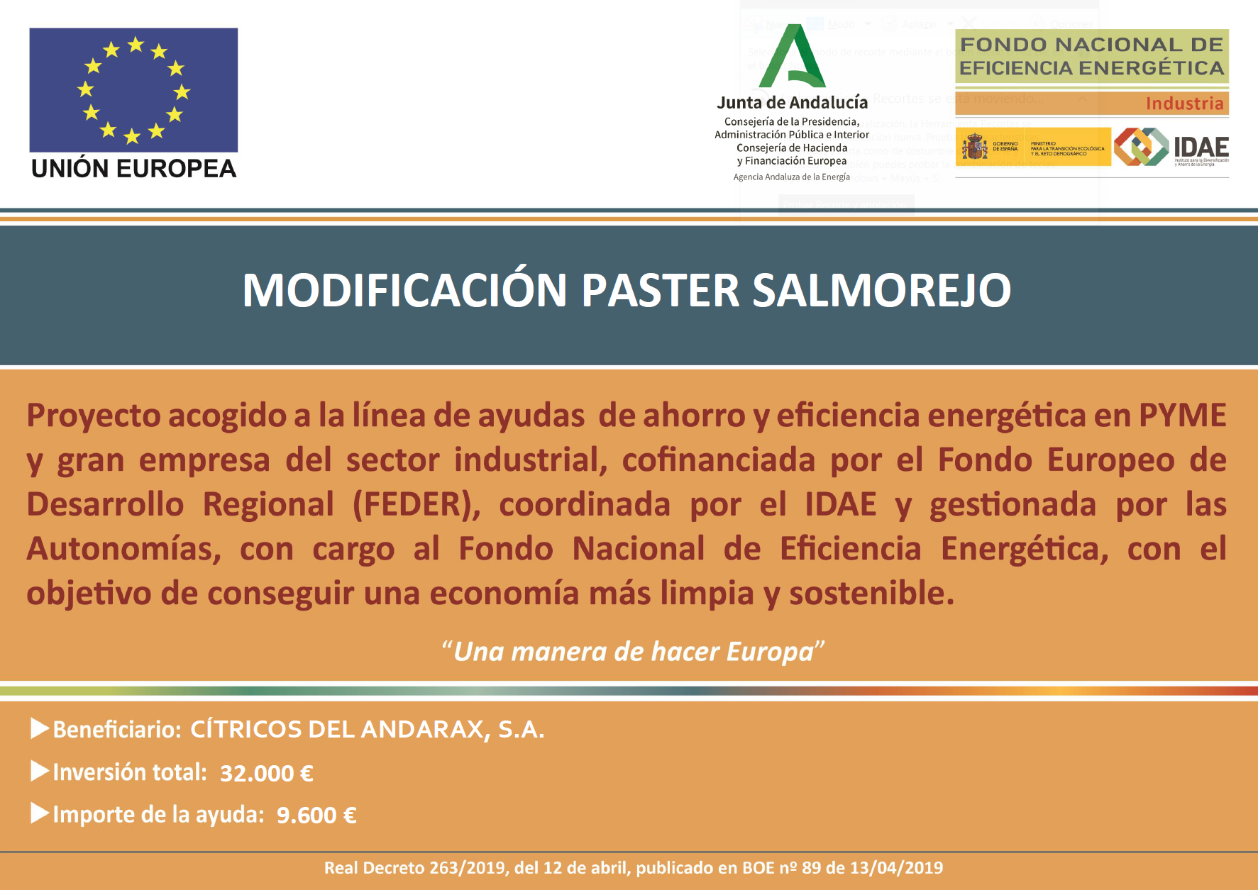CÍTRICOS DEL ANDARAX, S.A.ha recibido una ayuda para suproyectode ahorro y eficiencia energética“MODIFICACIÓN PASTER SALMOREJO”,cofinanciada por el Fondo Europeo de Desarrollo Regional (FEDER), coordinada por IDAE y gestionada por las autonomías, con cargo al Fondo Nacional de Eficiencia Energética, con elobjetivo de conseguir una economía más limpia y sostenible.Se ha elaborado un proyecto de ahorro y eficiencia energética consistente en la instalación de intercambiadores en la ampliación precalentamiento y el preenfriamiento; con esta medida tenemos una recuperación de energía del 70% gracias a la recuperación en el consumo de vapor, por otros que incorporan las técnicas más avanzadas en productividad y eficiencia energética. Se ha requerido la colaboración de los mejores fabricantes de equipamiento del sector, que nos aportarán grandes ahorros energéticos y medioambientales en el proceso. Gracias al proyecto se ahorran 52,72 teps anuales.