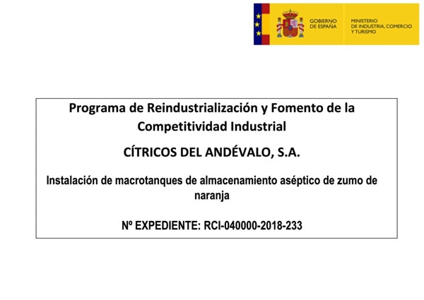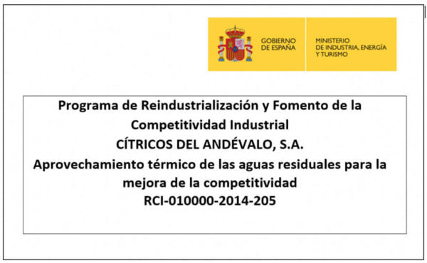 CÍTRICOS DEL ANDÉVALO, S.A. ha recibido una financiación del Ministerio de Industria, Energía y Turismo, dentro del Programa de Reindustrialización y Fomento de la Competitividad Industrial para el proyecto “Aprovechamiento térmico de las aguas residuales para la mejora de la competitividad”.