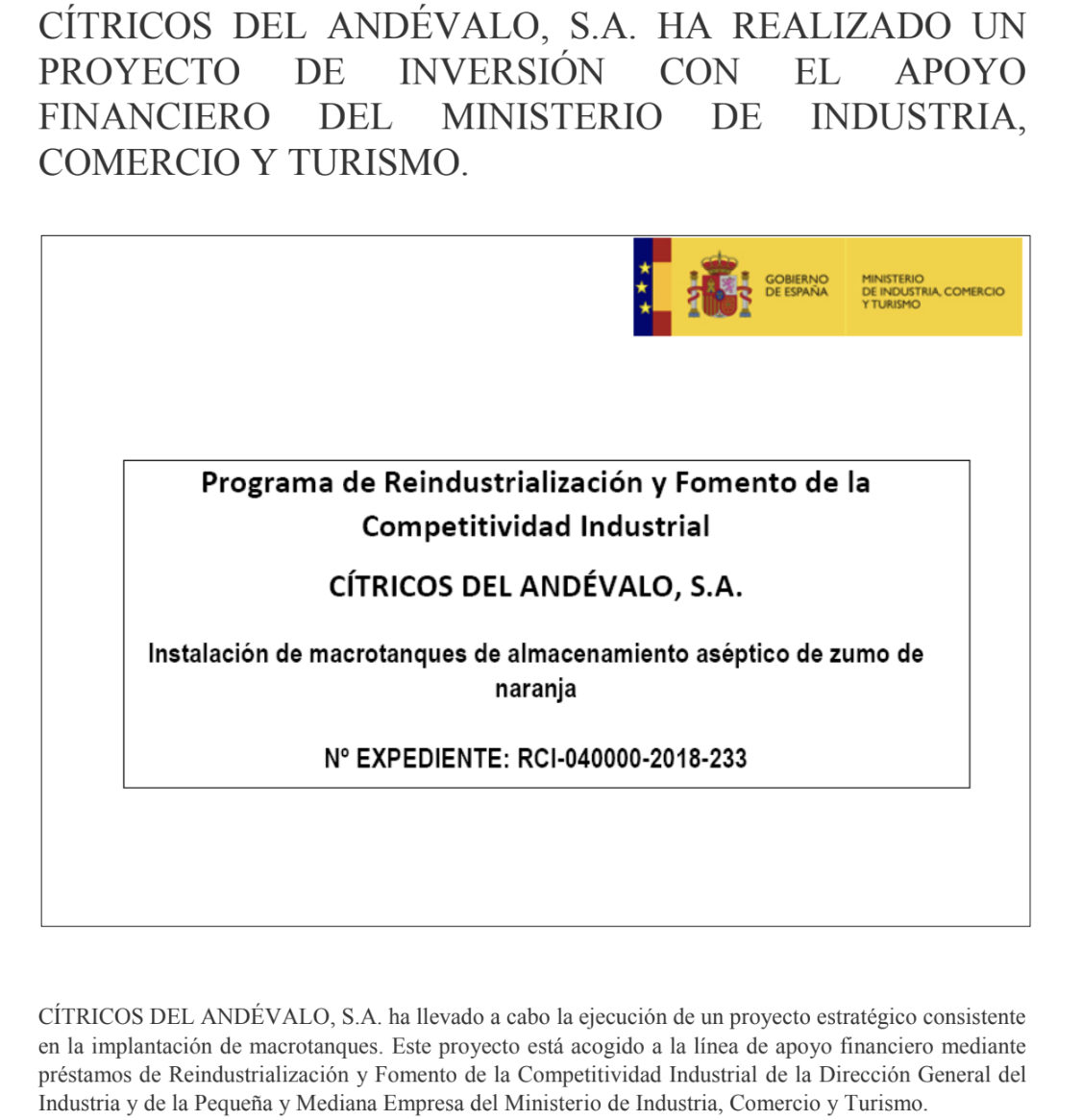CÍTRICOS DEL ANDÉVALO, S.A.ha llevado a cabo la ejecución de un proyecto estratégico consistente en la implantación de macrotanques. Este proyecto está acogido a la línea de apoyo financiero mediante préstamos de Reindustrialización y Fomento de la Competitividad Industrial de la Dirección General del Industria y de la Pequeña y Mediana Empresa del Ministerio de Industria, Comercio y Turismo.