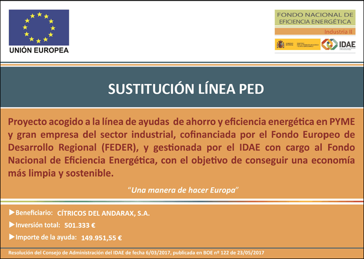 CÍTRICOS DEL ANDARAX S.A., ha recibido una ayuda para su proyecto de ahorro y eficiencia energética denominadoSUSTITUCIÓN LÍNEA PED, a través del FONDO NACIONAL DE EFICIENCIA ENERGÉTICA y gestionado por el INSTITUTO DE DIVERSIFICACIÓN Y AHORRO DE LA ENERGÍA (IDAE), ayuda cofinanciada por la Unión Europea a través del Programa Operativo FEDER de Crecimiento Sostenible 2014-2020. Se ha elaborado un proyecto de ahorro y eficiencia energética consistente ensustituir 2 líneas de envasado por una nueva línea más eficiente y de máximo rendimiento. Se ha requerido la colaboración de los mejores fabricantes de equipamiento del sector, que nos aportarán grandes ahorros energéticos y medioambientales en el proceso, consiguiendo un ahorro estimado de 73,72 tep/año.