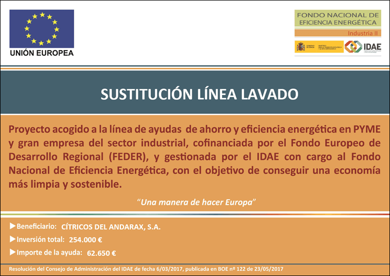 CÍTRICOS DEL ANDARAX S.A., ha recibido una ayuda para su proyecto de ahorro y eficiencia energética denominadoSUSTITUCIÓN LÍNEA LAVADO, a través del FONDO NACIONAL DE EFICIENCIA ENERGÉTICA y gestionado por el INSTITUTO DE DIVERSIFICACIÓN Y AHORRO DE LA ENERGÍA (IDAE), ayuda cofinanciada por la Unión Europea a través del Programa Operativo FEDER de Crecimiento Sostenible 2014-2020. Se ha elaborado un proyecto de ahorro y eficiencia energética consistente ensustituir la línea de lavado, por otra nueva de máximo rendimiento operativo. Se ha requerido la colaboración de los mejores fabricantes de equipamiento del sector, que nos aportarán grandes ahorros energéticos y medioambientales en el proceso, consiguiendo un ahorro estimado de 25,85 tep/año.