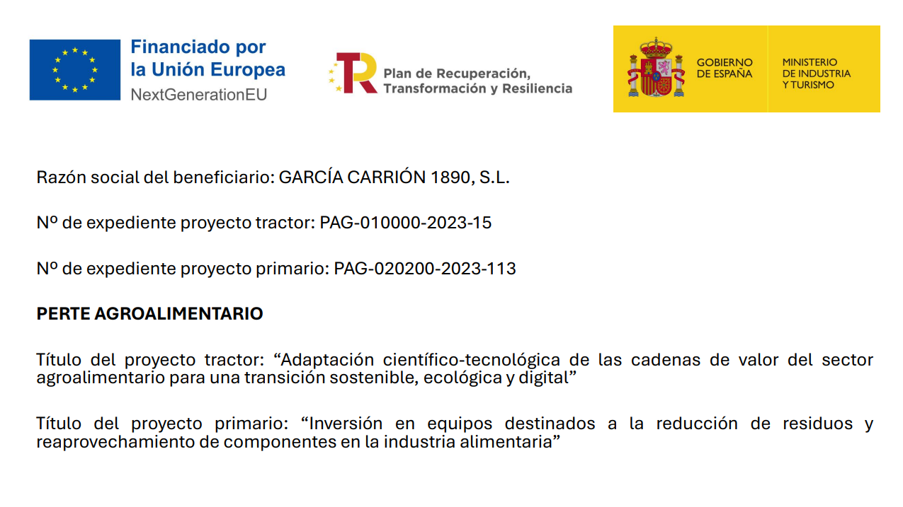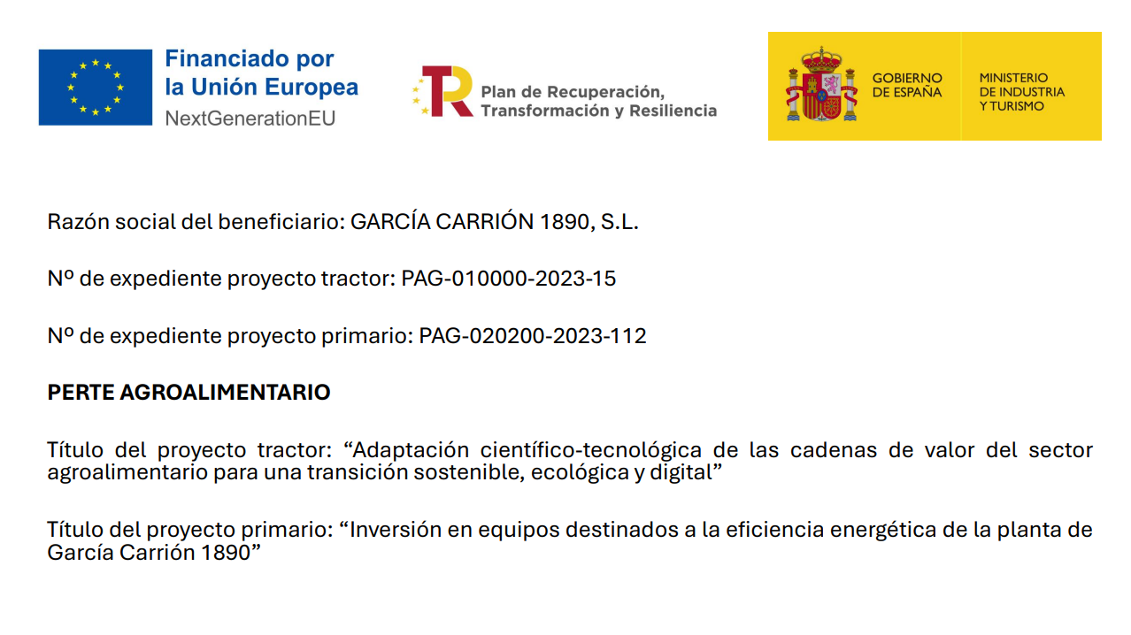 García Carrión 1890, S.L. ha llevado a cabo actuaciones de fortalecimiento industrial del sector agroalimentario dentro del PERTE AGROALIMENTARIO mediante los proyectos “Inversión en equipos destinados a la reducción de residuos y reaprovechamiento de componentes en la industria alimentaria” e “Inversión en equipos destinados a la eficiencia energética de las plantas de García Carrión 1890”, englobados en el proyecto tractor ECOFOOD – «Adaptación científico-tecnológica de las cadenas de valor del sector agroalimentario para una transición sostenible, ecológica y digital».