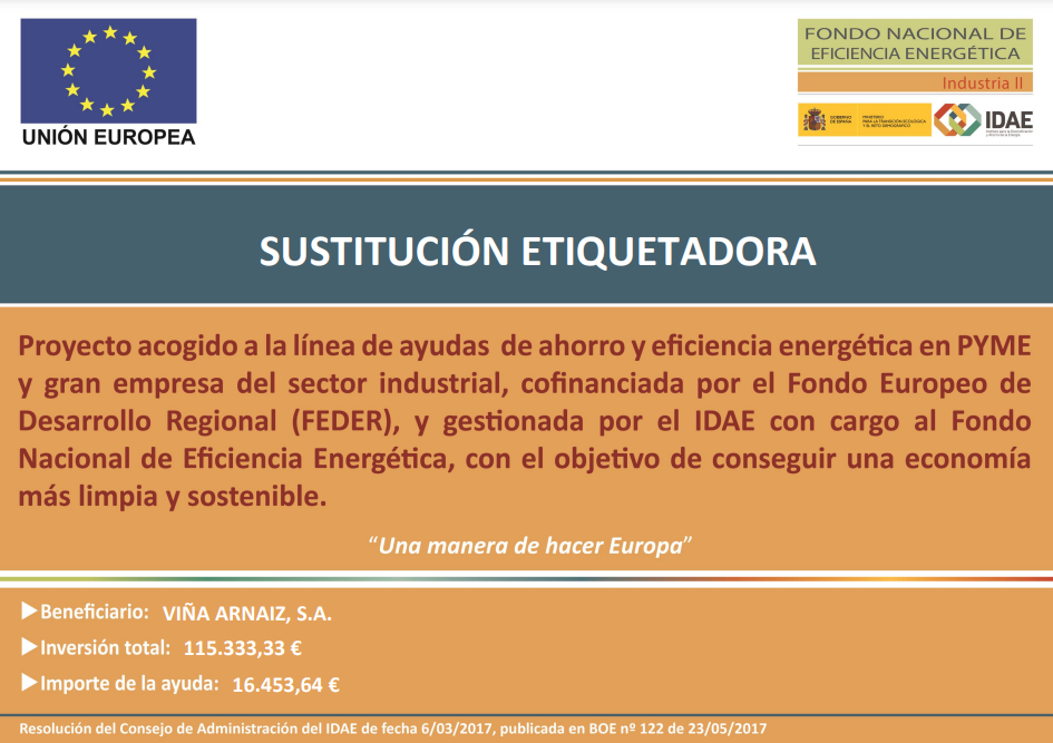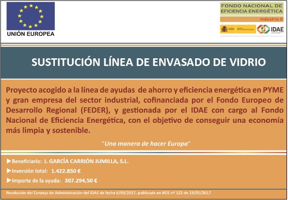 GARCÍA CARRIÓN JUMILLA, S.L., ha recibido una ayuda para su proyecto de ahorro y eficiencia energética SUSTITUCIÓN LÍNEA DE VIDRIO, a través del FONDO NACIONAL DE EFICIENCIA ENERGÉTICA y gestionado por el INSTITUTO DE DIVERSIFICACIÓN Y AHORRO DE LA ENERGÍA (IDAE), ayuda cofinanciada por la Unión Europea a través del Programa Operativo FEDER de Crecimiento Sostenible 2014-2020. Se ha elaborado un proyecto de ahorro y eficiencia energética consistente en la Sustitución de una línea de envasado de vidrio convencional, por otra que incorpora las técnicas más avanzadas en productividad y eficiencia energética. Se ha requerido la colaboración de los mejores fabricantes de equipamiento del sector, que nos aportarán grandes ahorros energéticos y medioambientales en el proceso, consiguiendo un ahorro estimado de 105,40 tep/año.
