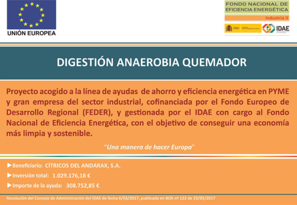 CÍTRICOS DEL ANDARAX S.A., ha recibido unaayudapara su proyecto de ahorro y eficiencia energética denominadoDIGESTIÓN ANAEROBIA QUEMADOR, a través del FONDO NACIONAL DE EFICIENCIA ENERGÉTICA y gestionado por el INSTITUTO DE DIVERSIFICACIÓN Y AHORRO DE LA ENERGÍA (IDAE), ayuda cofinanciada por la Unión Europea a través del Programa Operativo FEDER de Crecimiento Sostenible 2014-2020. Se ha elaborado un proyecto de ahorro y eficiencia energética consistente en implantar un proceso de digestión anaerobia de alta carga (EGSB) como pretratamiento a la planta aerobia existente (SBR)con el fin de reducir la carga orgánica y producir biogás. Se ha requerido la colaboración de los mejores fabricantes de equipamiento del sector, que nos aportarán grandes ahorros energéticos y medioambientales en el proceso, consiguiendo un ahorro estimado de 159,63 tep/año.