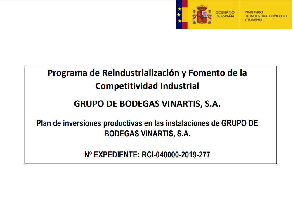 GRUPO DE BODEGAS VINARTIS, S.A. ha llevado a cabo la ejecución de un proyecto estratégico consistente en la construcción de una nave cubierta para depósitos de elaboración de vino y adquisición de diferentes activos productivos para aumentar la capacidad productiva de la bodega. Este proyecto está acogido a la línea de apoyo financiero mediante préstamos de Reindustrialización y Fomento de la Competitividad Industrial de la Dirección General del Industria y de la Pequeña y Mediana Empresa del Ministerio de Industria, Comercio y Turismo.