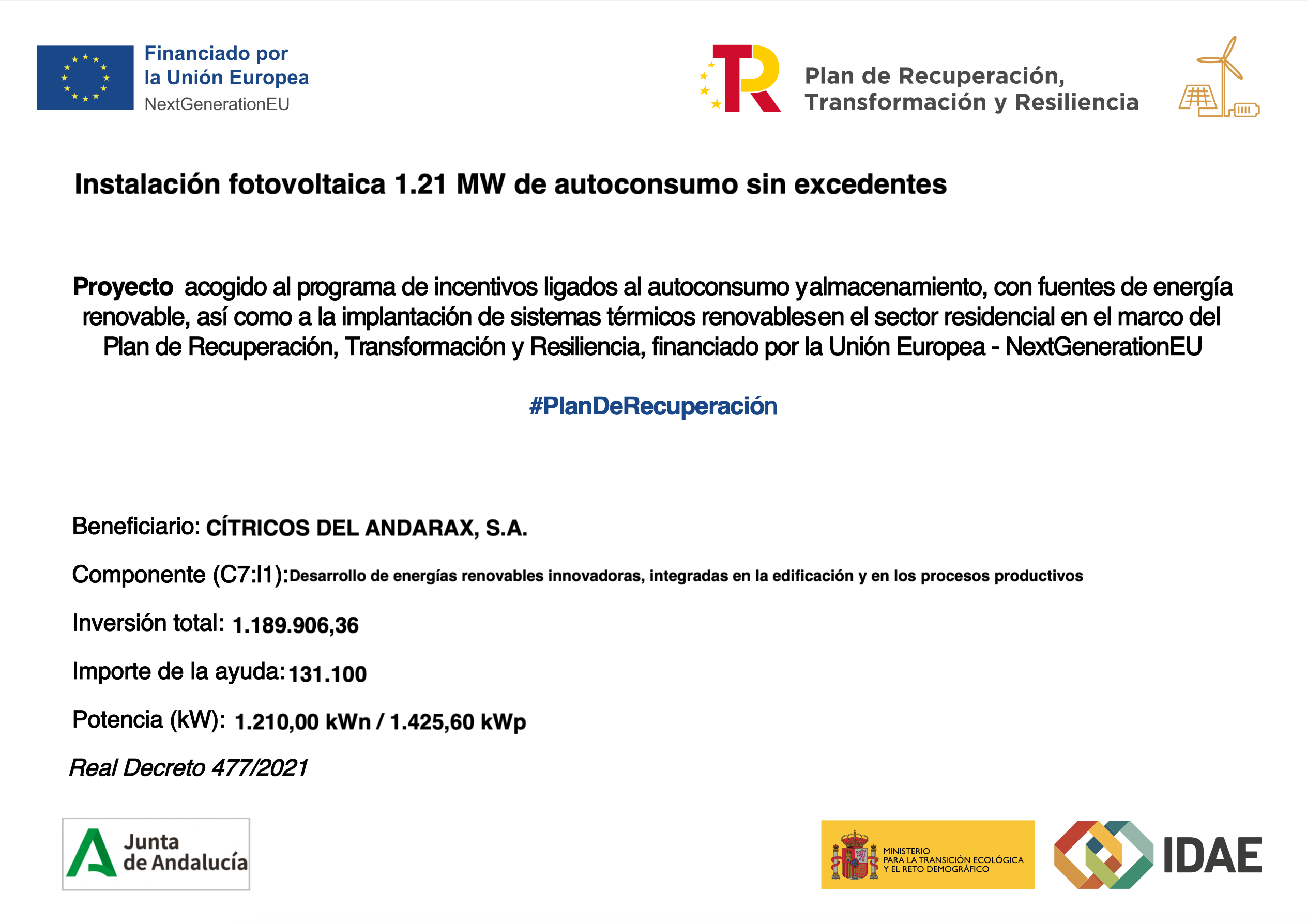 CÍTRICOS DEL ANDARÁX, SA., en línea con su compromiso con el medio ambiente, el fomento del uso de energías renovables y la reducción del consumo energético, ha llevado a cabo la implementación de una instalación fotovoltaica de autoconsumo sin excedentes sobre el terreno. La actuación ha sido financiada con el apoyo de la Unión Europea dentro del marco del Plan de Recuperación, Transformación y Resiliencia, a través de los Fondos Next Generation EU.