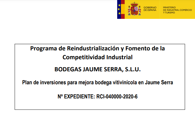 BODEGAS JAUME SERRA, S.L.U.ha llevado a cabo la ejecución de un proyecto estratégico consistente en lamejora de bodega vitivinícola.Este proyecto está acogido a la línea de apoyo financiero mediante préstamos de Reindustrialización y Fomento de la Competitividad Industrial de la Dirección General del Industria y de la Pequeña y Mediana Empresa del Ministerio de Industria, Comercio y Turismo.