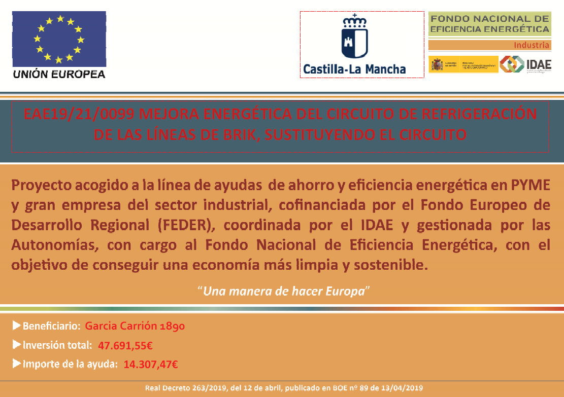 GARCÍA CARRIÓN 1890, S.L. ha recibido una ayuda para su proyecto de ahorro y eficiencia energética “INSTALACIÓN DE UNA CENTRAL DE COGENERACIÓN CON BIOGÁS”, cofinanciada por el Fondo Europeo de Desarrollo Regional (FEDER), coordinada por IDAE y gestionada por las autonomías, con cargo al Fondo Nacional de Eficiencia Energética, con el objetivo de conseguir una economía más limpia y sostenible. Se ha elaborado un proyecto de generación de energía eléctrica renovable a partir de la obtención de biogás de la EDAR. Se ha instalado un sistema de cogeneración mediante turbina para la generación de energía eléctrica. Se ha requerido la colaboración de los mejores fabricantes de equipamiento del sector. Los indicadores del resultado del proyecto han sido: indicador C030 = 1,2 MW e indicador C034 = 1.656 tCO2/año.