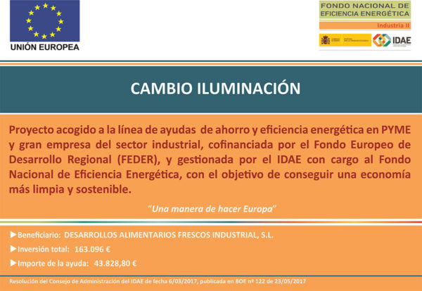 CÍTRICOS DEL ANDARAX, S.A.,ha recibido unaayudapara suproyectode ahorro y eficiencia energéticaREFORMA INSTALACIONES FRÍO, a través delFONDO NACIONAL DE EFICIENCIA ENERGÉTICA y gestionado por el INSTITUTO DE DIVERSIFICACIÓN Y AHORRO DE LA ENERGÍA (IDAE),ayuda cofinanciada por la Unión Europea a través del Programa Operativo FEDER de Crecimiento Sostenible 2014-2020. Se ha elaborado un proyecto de ahorro y eficiencia energética consistente en una mejora del sistema frigorífico para mejorar su eficiencia energética con la incorporación de un nuevo compresor para dar soporte el sistema frigorífico los fines de semana, por otros que incorporan las técnicas más avanzadas en productividad y eficiencia energética. Se ha requerido la colaboración de los mejores fabricantes de equipamiento del sector, que nos aportarán grandes ahorros energéticos y medioambientales en el proceso, consiguiendo un ahorro estimado de 54,18 tep/año.