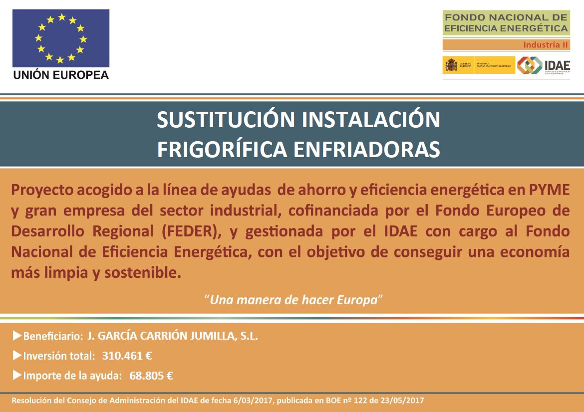 GARCÍA CARRIÓN JUMILLA, S.L., ha recibido una ayuda para su proyecto de ahorro y eficiencia energéticaSUSTITUCIÓN INSTALACIÓN FRIGORÍFICA ENFRIADORAS,a través del FONDO NACIONAL DE EFICIENCIA ENERGÉTICA y gestionado por el INSTITUTO DE DIVERSIFICACIÓN Y AHORRO DE LA ENERGÍA (IDAE), ayuda cofinanciada por la Unión Europea a través del Programa Operativo FEDER de Crecimiento Sostenible 2014-2020. Se ha elaborado un proyecto de ahorro y eficiencia energética consistente en la mejora de una instalación frigorífica para mejorar su eficiencia energética. Se ha requerido la colaboración de los mejores fabricantes de equipamiento del sector, que nos aportarán grandes ahorros energéticos y medioambientales en el proceso, consiguiendo un ahorro estimado de 30,63 tep/año.