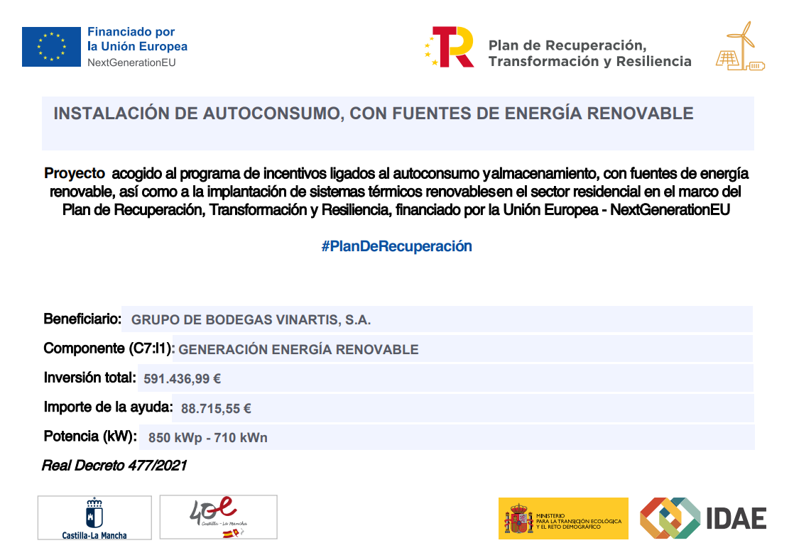 GRUPO DE BODEGAS VINARTIS, S.A., en línea con su compromiso con el medio ambiente, el fomento del uso de energías renovables y la reducción del consumo energético, ha llevado a cabo la implementación de una instalación fotovoltaica de autoconsumo sin excedentes. El objetivo principal de la misma ha sido generar electricidad de manera sostenible y eficiente, y, asimismo, reducir su dependencia de fuentes de energía convencionales, mejorando la seguridad de abastecimiento. La actuación ha sido financiada con el apoyo de la Unión Europea dentro del marco del Plan de Recuperación, Transformación y Resiliencia, a través de los Fondos Next Generation EU. La implementación se ha llevado a cabo en el centro productivo de la sociedad ubicada en Valdepeñas, y ha implicado la instalación de inversores y módulos fotovoltaicos en las cubiertas de las instalaciones, con una potencia total de generación de 850 kW y una potencia nominal de inversores de 710 kW. La inversión ha ascendido a un total de 591.436,99 €, de los cuales han sido subvencionados 88.715,55 €.