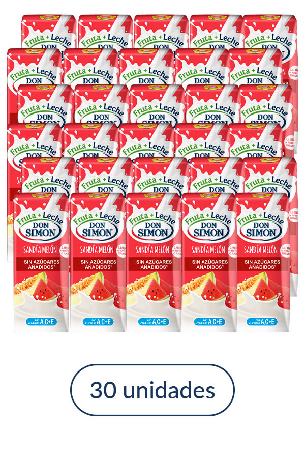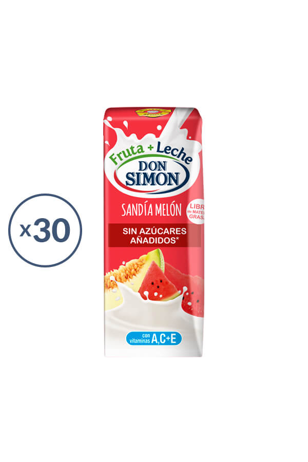 Fruta + leche Don Simón Sandía y melón. Elaborado con melón, sandía y leche desnatada. Sin azúcares añadidos y rico en vitaminas A,C y E.