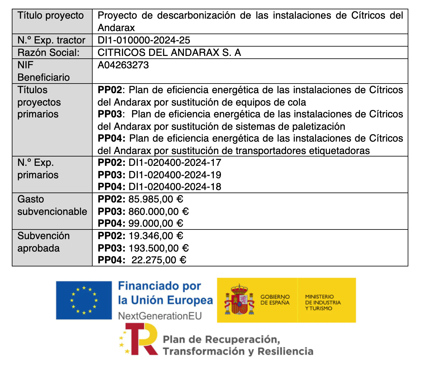- Empresa beneficiaria: CITRICOS DEL ANDARAX, S.A.